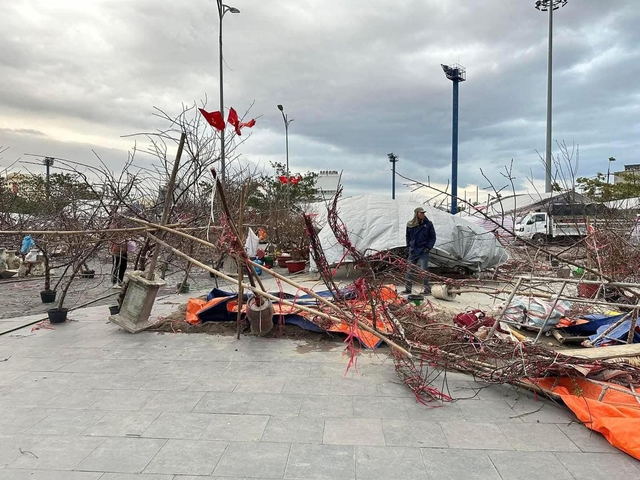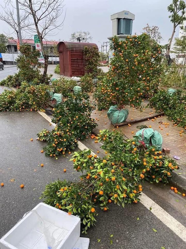 Không khí lạnh cường độ rất mạnh tràn về, kéo theo gió mùa đông bắc đã quật đổ những cành đào, chậu quất cảnh bày bán trong các chợ hoa Tết Ất Tỵ ở Hà Nội, Thái Nguyên, Bắc Giang… Ảnh: MXH
