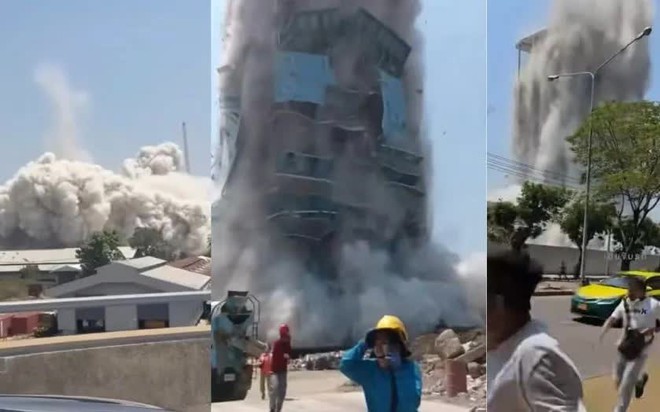 Hình ảnh ghi lại cảnh tượng tòa nhà cao hơn 30 tầng ở thủ đô Bangkok, Thái Lan đổ sập do ảnh hưởng của trận động đất mạnh 7,7 độ tại Myanmar hôm 28/3/2025. (Ảnh: MXH)