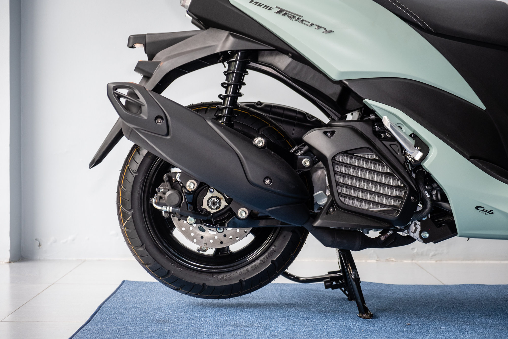 Phía trước dùng lốp kích thước 90/80, mâm 14 inch, còn phía sau dùng lốp 130/70, mâm 13 inch. Hệ thống phanh của Yamaha Tricity 155 là sự kết hợp giữa phanh đĩa, công nghệ UBS (phanh liên kết) và công nghệ ABS (chống bó cứng phanh) cho cả bánh trước và sau.